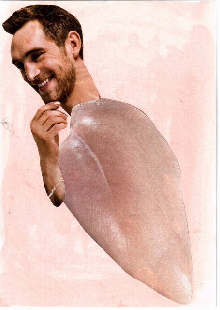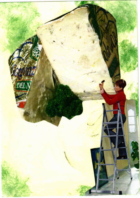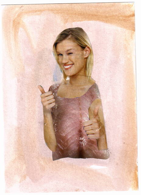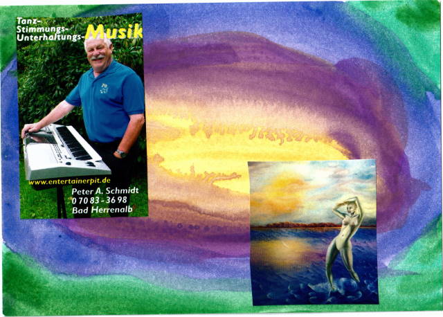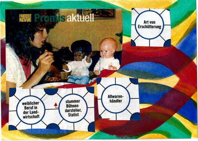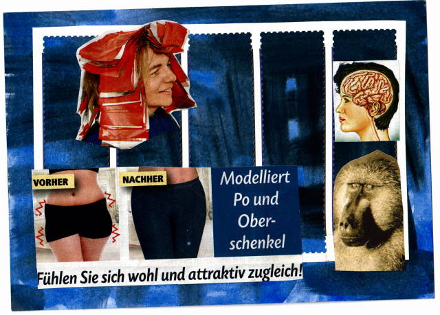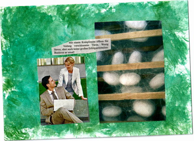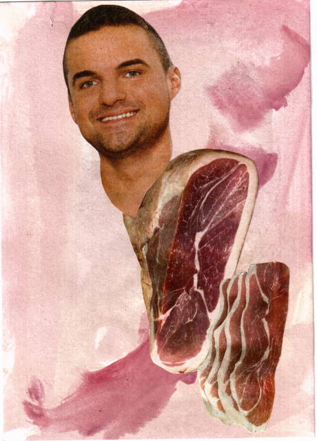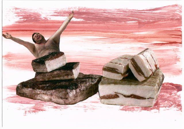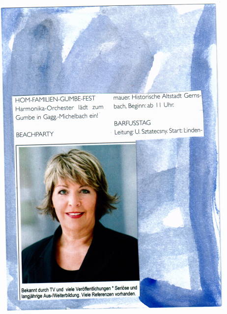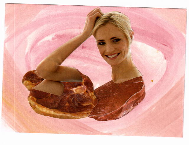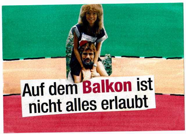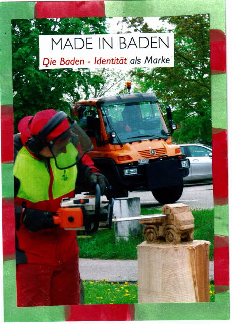 Frühstück am nächsten Morgen in skurriler Schwarzwaldoptik. Riesige braune Lampen wie rostige Absaugrohre und an der Decke statt eines weißen Plastiktülle ein riesiger geschnitzter Holzsockel an der Decke, massiv, ca. 1 Meter Durchmesser. Ich mache mich darüber lustig und kann auch die Einheimischen auch zum Lachen bringe und mache Fotos. Gegenüber vom Parkplatz sitzt der Typ wieder vor dem Haus. Abschied. Auf dem Rückweg halten wir noch in Gernsbach, idyllisches Städtchen mit Fluss und besuchen dort die ganze Familie mit weiteren Verwandten. Dort nehme ich eine Edeka-Werbebeilage mit, die mir dazu verholfen hat die Wurstfamiliencollagen zu machen. Der aufmerksame Leser weiß, was gemeint ist. Solche herrlichen Fleisch- und Wurstbilder gibt es bei uns nicht mehr als Zeitungsbeilage. Früher ca. 2000-2002 habe ich große Serien mit Wurstfamilien gemacht, aber damals taugte dazu der Real-Prospekt. Das kann man heutzutage bei uns alles vergessen. Blasse, kleine Bilder. Nicht zu gebrauchen. Meine Eltern fahren uns in Gernsbach zum Zug. Ich mag es bei solchen Gelegenheiten, wenn es nur ein Gleis gibt. Der Abschied ist irgendwie wehmütig von meiner Seite. Das liegt bestimmt am fortgeschrittenen Alter der Beteiligten und weil es wieder mal so schön und intensiv war und die Vergänglichkeit präsent ist.