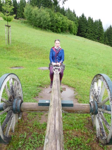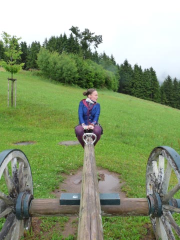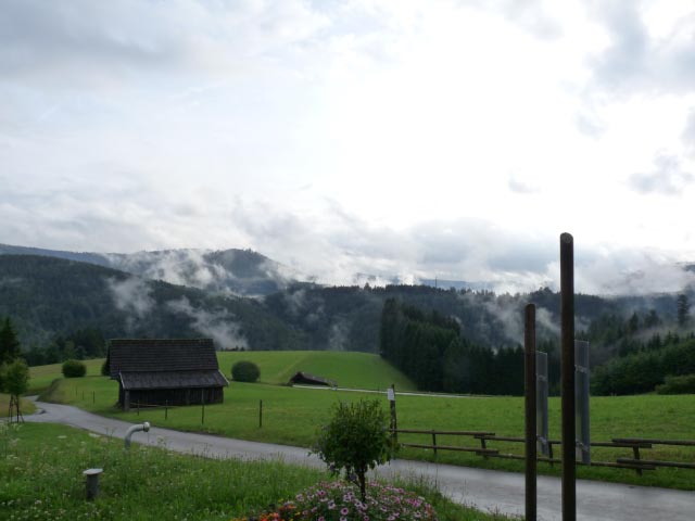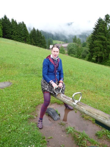Ich frühstücke eigentlich nicht, aber an diesem Samstag esse ich 2,5 dick belegte Brötchen und nehme ½ mit. Wir sind alleine im Wintergarten und es gibt sehr leckere Wurst, frisch und geräuchert sowie drei verschiedene selbstgemachte Marmeladen, die durchprobiert werden wollen und ein frisches Ei und viel leckere Butter, nicht so geizige kleine Stücke, sondern 3-4 100 Gramm Scheiben. Dann geht die Reise los. Die Laune ist bestens. Ich habe wahnsinnig Glück, dass ich noch so „rüstige“ Eltern habe, mit über 75. Die wollen nicht rumsitzen und sich ausruhen, sondern was erleben und es macht auch noch Spaß mit ihnen unterwegs zu sein. Der Vorteil des Landkreises Rastatt wird mir schnell klar. Es ist als würde man von Linden nach Wunstorf fahren und dann ist man an einer deutschen Außengrenze. Das ist schon sehr reizvoll. Man wird als Autofahrer direkt zur Fähre gelenkt auf die 10 Fahrzeuge passen. Das Ding pendelt im Sommer zwischen 6 Uhr und 22 Uhr ständig hin und her über den Rhein und der Spaß ist umsonst. Dann fahren wir über Dörfer mit kleinen Verkehrskreiseln und knallbunten Häusern nach Bischwiller und direkt in den Supermarkt. Neben gesüßter Kondensmilch kaufe ich allerhand Kekse und eine große Packung Creme Fraiche. Die Butter ist nur Supermarktbutter und erscheint mir nicht kaufenswert, zumal wir vor wenigen Wochen aus einem Pariser Käseladen die leckste Salzbutter (nicht zu salzig) namens Prairie importiert haben und ich jetzt noch Gänsehaut bekomme, wenn ich an die denke. Ich bewundere das Sortiment, u.a. riesige Dosen mit Froie Gras, wie Thunfischdosen, aber 5 x so groß und Schnecken und so was. Halt französisch. Leider lasse ich die runden weißen Zuckerwürfel (!) zurück, aufgrund ihres Gewichts für den Koffer und mangels einer Verwendung. Das werde ich später bereuen, weil es mir keiner glaubt, dass es so was gab. Nach dem Supermarkt fahren wir zum historischen Markt, wo gerade ein historisches Haus abgerissen wird. Irgendwie ist hier der Hund verfroren. Wir bekommen aber noch einen guten Tipp und landen in einem nette, urigen Lokal mit tollen, detailreichen Scherenschnitten statt Gardienen an den Fenstern und obwohl ich noch total satt bin, kommt kneifen nicht in Frage und ich esse einen leckeren Salade Nicoise mit warmen gebratenen Fischen und teile mir ein Glas Süßwein mit meinem Vater. Anschießend 2 Kaffee, damit es weitergehen kann. Bei den Gastgebern eingetroffen nutzen wir die Ruhe vor dem Sturm für eine Siesta. Ich teile ein Bett mit meiner Mama und mein Vater schläft als einziger sofort ein. Der alte Power-Naper und Mittagschlafkönner. Das Ruhen tut auch gut. Die andere Gäste treffen ein, u.a. mein Bruder und Familie und wieder gibt es leckeren Sekt vom Nachbarn und Kuchen und Kaffee. Draußen regnet es mittlerweile wie unter der Dusche und der herrliche Blick übers Tal nach Strasbourg bietet einen Anblick der anderen Art. Im Konvoi geht es nach Baiersbronn zum Hotel Löwen. Diese Schwarzwaldhochstraße mit den Serpentinen verursacht bei mir leichte Übelkeit und ein paar Kilometer fühlen sich an wie ein Tagesausflug. Im Ort angekommen, sind wir nun wirklich im Schwarzwald- hardcore. Das Hotel liegt an der Straße, gegenüber steht ein Haus, dessen Bewohner immer vor der Tür sitzt auf einer Bank und guckt, wie die Stadtmenschen älteren Datums z.T. mit Kissen bewappnet am Fenster hängen. Umziehen und vor der Tür treffen. Der Shuttleservice bringt die Gäste, die überwiegend in Tracht gekleidet sind, was ich vorher wusste, weil das Thema Bergfest lautet, nach und nach zur Hütte. Oben ist Heidi-Flair und es lichtet sich. Geheimnisvoll hängt der Nebel in den dichten, dunklen Wäldern gegenüber. Die Aussicht ist super, die Wippe aus dem alten Wagenrad wird gleich ausprobiert und es gibt Hugo mit leckeren Schnittchen. Schwarzwälder Schinken ist Ehrensache, aber ich stehe auf die in Streifen geschnittene Blutwurst. Es folgt ein vorsichtiges Annähern mit den anderen Gästen. Spätestens nach der herzzerreißenden Ansprache des Gastgebers und seinem Vorstellen der Gäste ist das Eis gebrochen. Die Gäste sind überwiegend so ca. im Alter des Gastgebers und fast durchweg sehr sportlich, sympathisch und aufs gut Essen und Trinken und Feiern bedacht. Die Nachbarn mit dem eigenen Sekt, ich nenne sie mal „Naaber“, werden in der Rede erwähnt mit den Worten, dass sie, die Gastgeber, manchmal in den Naab-Falle geraten würden. So nennen sie es, wenn sie Sonntagmorgen um 10 Uhr mit dem Hund Gassi gehen wollten und nachts um 1 angeschickert und gut gelaunt wieder werden nach Hause kämen. Wer will nicht solche Nachbarn, mit einer eigenen Sektmarke? Uns gegenüber sitzt ein gutaussehender, korpulenter Mann aus Peru, der begnadet gut kochen soll („der kocht Sachen, die man nicht mal in der Sternegastronomie zu essen bekommt“, so der O-Ton des Gastgebers) und seine Frau, die Direktorin einer Grundschule ist und strahlend blaue Augen hat. Auf Nachfrage: Die beiden haben sich in Italien auf einer Hochzeit kennen gelernt. Sehr romantisch, wie ich finde. Gruselig am Tisch sind die Zeckengeschichten, von kleinen Töchtern, von denen man jeden Abend 10 – 20 absammeln müssen, dafür reiche es einmal ums Haus zu gehen, das hänge mit dem Efeu zusammen und die seien hellbraun und ganz klein, so dass man sie ertasten müsse. Mich zuckt es überall. Mein Beitrag zur Konversation besteht daraus, dass ich keinen Hehl daraus mache, dass mir der Schwarzwald Angst macht und ich unter keinen Umstände bei Dunkelheit überhaupt oder auch tagsüber alleine vor die Tür treten würde. Das löst Erstaunen aus. Warum lautet die Nachfrage. Meine Antwort lautet, dunkler bedrohlicher Wald, undurchdringbar, steile Hängen mit igelförmigen Schokoladentrüffeln und Kindermissbrauch, das seien meine Assoziationen. Die Einheimische schmunzeln. Dann erkläre ich ihnen auch, was schön ist am Norden. Die Landschaft ließe zu wünschen übrig, aber zwischen 