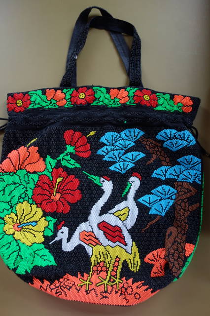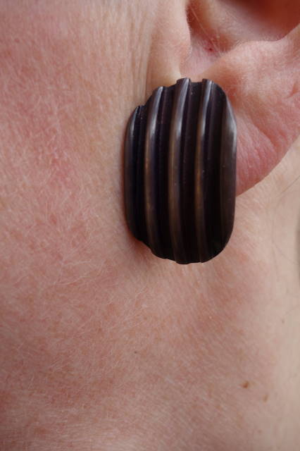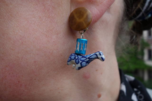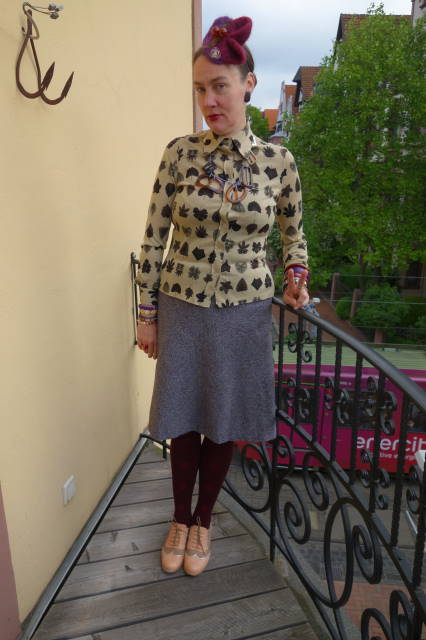 (der Laden, in dem die Frau Mama für ihren Künstlersohn verkauft hat, Jill Sandler Stofftaschen gab es dort und er lag noch im Bett) darf sie nur behalten, wenn sie auch getragen wird, streng wie meine Freundin Claudia meint, aber so sind wir, die Textilversessenen. Es muss nicht sein, dass die Tasche von einer Ecke bei mir in die nächste bei ihr wandert. Sie versteht das. Dazu ein langer Rock aus Wolle mit verschiedenen vor allem Lilatönen in Wellen, vorne mit Knopfleiste und weißen Knöpfen mit Goldrand. Den wird sie kürzen und vielleicht ein Oberteil daraus nähen und ein Polyestergrafikkleid aus Berlin.