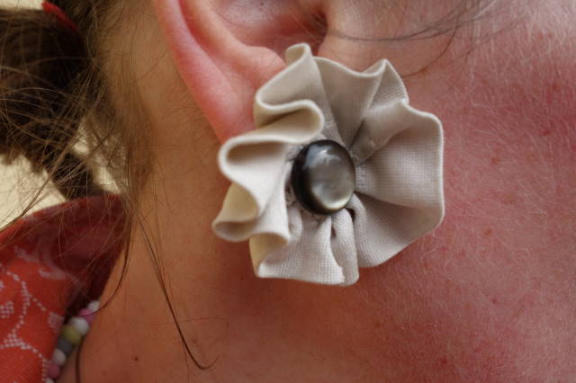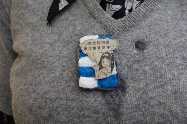 War ich Schwimmen, fragt die Betreute aus Sri Lanka, deren Sohn jetzt Schwimmunterricht nimmt. Nein, das ist nur ein kleiner Teil meiner Buttonsammlung auf ein Handtuch gesteckt.