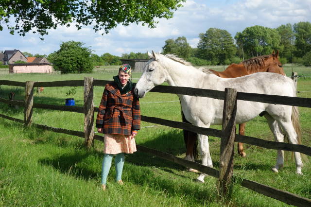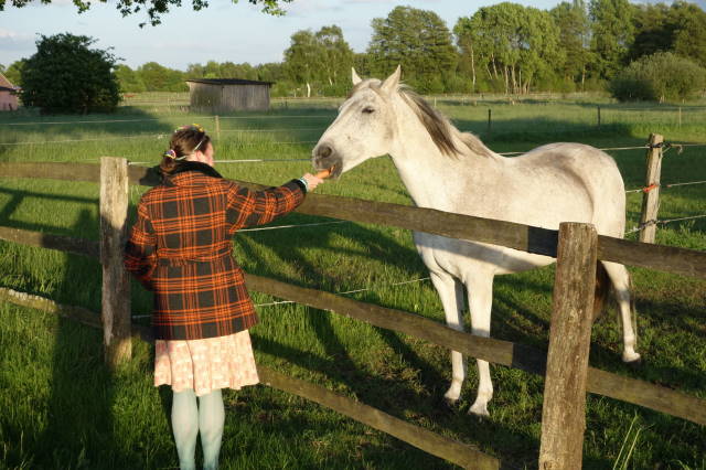 Wir fahren vorbei an den Pferden und das schöne, weiße mit den Sommersprossen, fällt mir gleich auf. Als wir schon vorbei sind, wiehert es wie ein Bauarbeiter, der mir hinterher pfeift.