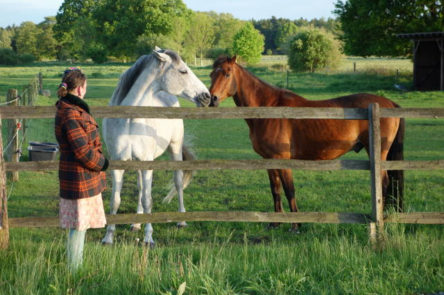 Die Rechnung für Heizöl schauen wir uns zusammen an. Dieter bekommt Geburtstagsanrufe u.a. einen ungebetenen von Yellow Strom und es gefällt mir, wie lakonisch mein Schweigervater sagt: „wissen Se was und das interessiert mich gar nicht, was Sie da machen“. Er begleitet uns auf dem Rad zurück zur Bahn und „mein Apfelschimmel“ lässt sich von weitem anlocken. Er stand ganz hinten und kommt nach vorne, zusammen mit seinen braunen Kollegen. Die hätten ruhig weg bleiben können. Er legt die Ohren an und verteidigt mich gegen die Mitstreiter. Bin ich seine Beute oder sein Weibchen? Wenn ich mich doch mit der Pferdesprachen auskennen würde. Eine Möhre war auch zu wenig. Die hat er auf einmal geschluckt.