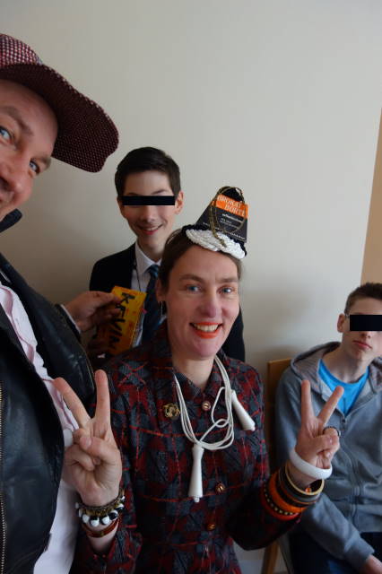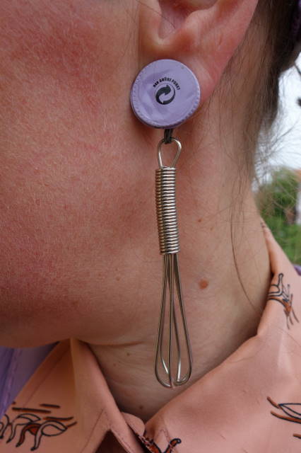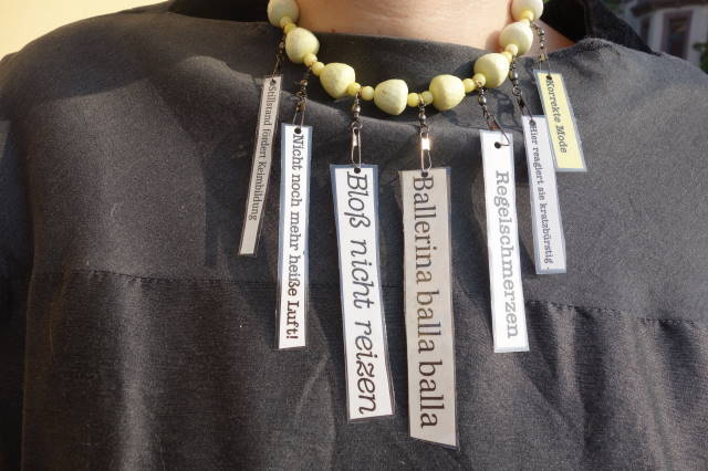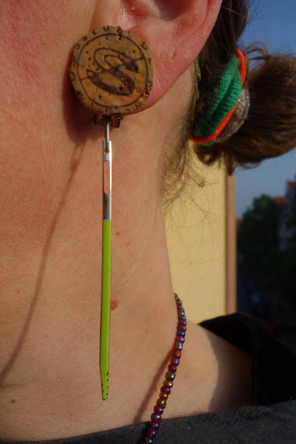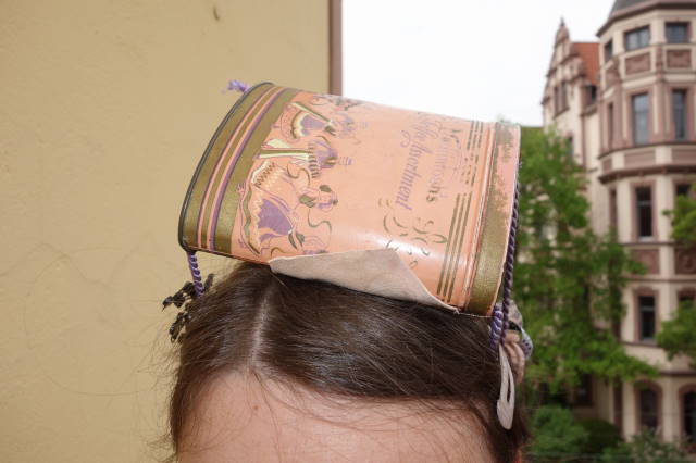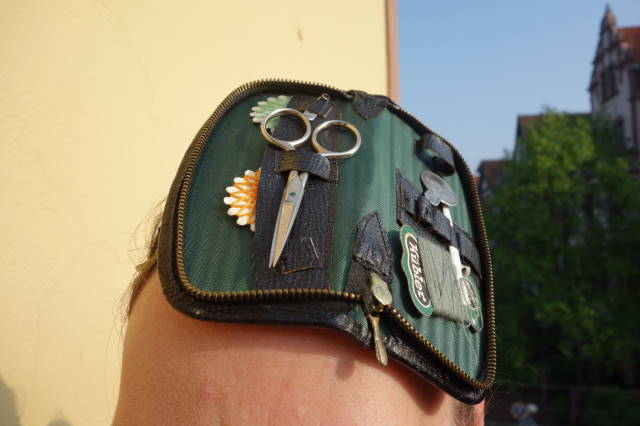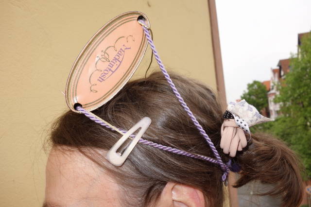 01.05. Der erste Mal 1. Mai mit Regen, zumindest in meiner Erinnerung. Nach Kopfschmerzen am Vorabend bis 11 Uhr geschlafen. Tee trinken und basteln. Hütchen aus dem Metallhaarspangen vom Flohmarkt Revaler Straße. Ich habe bunte Wollreste, wiederum vom Käte auf die Wickler gewickelt. O.k. das wird ein Hingucker, aber nicht so doll wie die Metallbonbondose, die ich mir heute zum Ziel genommen habe. Ich habe sie auf dem Flohmarkt am Wasserturm geschenkt bekommen, aber ob der Schenker es so gewollt hat…Stephan ist zum Tramplatz und trifft dort Detlef, Karin und Stella und ich sitze im Wintergarten und nähe. Ich denke, vielleicht kein Hütchen, weil Claudia das nicht so mag und das ist das Ergebnis. Setze mich in der Bahn zu 3 Jungs, die sich nicht mehr einkriegen vor Lachen. Was das Outfit zu bedeuten hat, will der kleine, dünne wissen. Was hat denn Dein Outfit zu bedeuten, lautet meine nicht so originelle Gegenfrage. Seines sei „normal“, aber ich hätte eine Dose auf dem Kopf und Schneebesen an den Ohren. Er würde sich schämen so in die Bahn zu steigen und dann auch noch in die Innenstadt zu fahren. Was der Junge nicht weiß, ich will damit sogar nach Hamburg fahren und frage mich, ob ich das nicht noch bereuen werde und überlege das Hütchen abzusetzen, Stephan, der mich in der Bahn nicht gegen die Kinder verteidigt hat, ist aber dagegen und meint , es würde wohl wirklich vehemente Reaktionen auslösen, so wie die Leute sich im Bahnhof umdrehen und der ganzen Clique Bescheid sagen, geil, aber er finde es nicht so auffällig. Doch, irgendwie schon. ich habe deutlich das Gefühl, dass ich es diesmal übertrieben habe und bequem ist es auch nicht. Schon statisch ist es nicht abnahmefähig. Da sitze ich nun auf der Bahnsteigkante und der Zug hat 15 Minuten Verspätung.