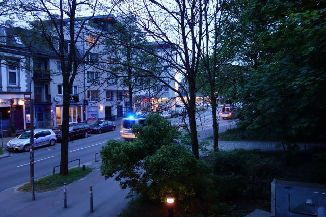 Wir hören laut Musik und beobachten die Straßensperrung der Polizei am Schlump und das Durchfahren von ca. 40 Fahrzeugen. Ich sage, cool, Krawalltourismus und wir sind im gesperrten Gefahrengebiet, aber alles bleibt ruhig. Ist zu kalt und kein Demo-Wetter.