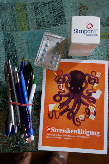 Nachdem meine Suizidbetreute mir gestern anvertraut hat, dass sie sich nicht entspannen kann und ich feststellte, dass wir – auch in diesem Punkt – gegensätzliche Charaktere seien, weil ich fast zu gut und schnell entspannen könne. Sie hat alle Techniken durch und sogar selber eine therapeutische Ausbildung gemacht. Diese Imaginationsübungen richten sich immer gegen sie und ich sage, meiner Meinung nach, zu verkopft, es muss über den Körper laufen. Heute beim Pilates beugt sich eine Teilnehmerin über mich und sagt, ich sähe so entspannt aus und ich: „war ich auch, Schwester, ist jetzt Fieber messen?“.
