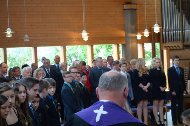 Zwei Reihen vor uns sitzt Herr Rösler, den Kathrin neulich im Flieger für Yunfeng gehalten hat. Ein kleines Mädchen vor mir ist von mir sehr fasziniert. Der Dirigent des Chores trägt einen Schal in Regenbogenfarben (Gay Pride mäßig) und die Chormitglieder sich je nach Stimmlage farblich auch schalmäßig ausgestattet bzw. abgestuft von gelb, blau bis hin zu weinrot. Der Pastor hält eine nicht nachvollziehbar Predigt über die Ampelmännchen, die ihn an den Gekreuzigten erinnert hätten und er habe sich über so viel christliche Symbolik in der DDR gewundert und es sei auch das Segenzeichen und wenn man zwei Ampelmännchen an einander stellt, ergibt das eine Menschenkette und das ist der Zusammenhalt in der Gemeinde der Christen. Schon mal was von an den Haaren herbeigezogen gehört? Die „Konfis“ bekommen Türschilder mit Ampelmännchen, damit sie „Stopp, jetzt Privatsphäre, aber frag ruhig warum und wie es mir geht“ bis hin zu „komm rein, ich bin bereit“ alles signalisieren können. Vielleicht auch „Bitte Zimmer aufräumen“ als Hinweis an die Mütter, wie später bei uns am Tisch gescherzt wird. Die Konfirmanden sollen das letzte Stück zusammen mit dem Chor singen. Das klappt eher schlecht und sie ziehen aus der Kirche und empfangen die Gemeinde draußen als Spalier.