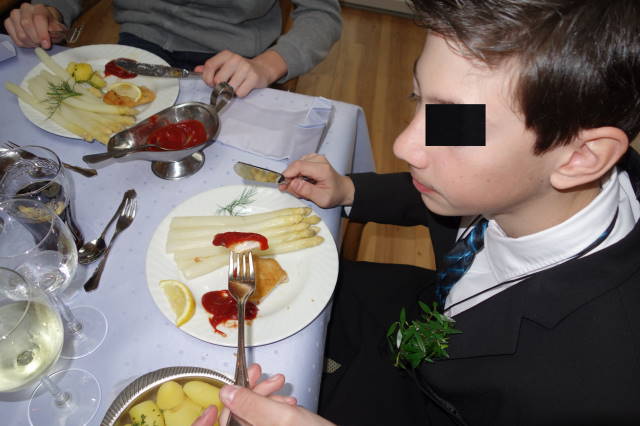 Bei uns geht es weiter mit Spargelmenü in einer Gastronomie, die heute voll ich mit Konfirmationsgesellschaften und einem Freund von K. kommt dazu, den ich frage, ob er nächste Woche dran ist um zu erfahren, dass er keine Konfirmation macht und auch Wert und Norm als Schulfach hat. „Ja, und wie will er das finanzielle Loch stopfen?“ Will ich dann von ihm wissen. Über Geburtstage, lautet die sympathische Antwort. Ich schlage K. vor, dass wir für seinen Freund sammeln oder er was von seinem Reichtum teilen müsse. Unsere Kölner Freundin hatte noch gestern Abend von ihrer Jugendweihe erzählt. Der Konfirmand und sein Kumpel essen den Spargel immer noch mit Ketchup. wie damals. ich kann es nicht fassen, dass die Kindheit offenbar gastronomisch voll andauert.