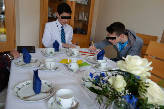 Er sitzt vor dem großen Stapel aus Briefumschlägen und sein Freund hilft ihm Buch zu führen. Die Karten werden nach Aufforderung laut verlesen und der Geldbetrag wird sowohl in eine Liste eingetragen als auch auf den Umschlag geschrieben.