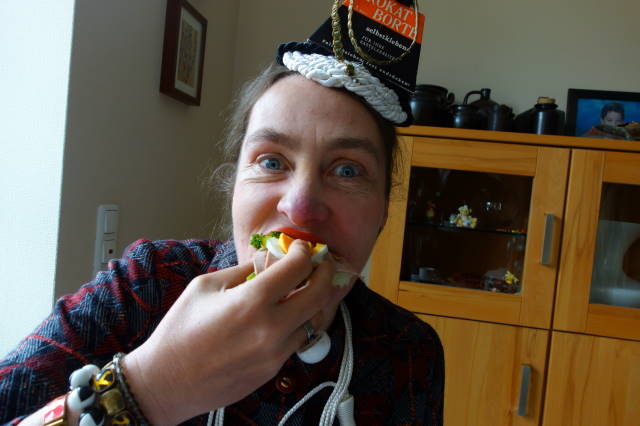 Im Kunstverein wird ein Typ verabschiedet, über dessen Wegzug aus Hannover ich mich nur freuen kann. Will schon so was wie: immer schön Beratungsdienstleistungen bezahlen auf die Abschiedstafel schreiben, aber ich stehe darüber. Er ist ein farbloser Langweiler, meiner Meinung nach. Er redet lang und langweilig und wir fallen über das Büffet her, was armselig ist, wie die ganze Veranstaltung und aus meinen Umsonstpackung Nimm 2 Lachgummis besteht und schlechter Salami und schlechtem Käse. Das einzige Highlight ist eine Bigband in veränderten Blaumannuniformen mit Putzschwämmen als Schulterposter umrahmt von goldenen Fransen, die spielt und wir kennen einige der Herren die sich hier zusammen getan haben (es sind 19), u.a. unseren begabten Tischler, der ein großes, kompliziert aussehendes Blasinstrument spielt. Ich frage nach dem Auftritt, ob sie sonst auf Beerdigungen spielen, weil es so New Orleans mäßig rüber kommt. Ein Kostüm kann Leute verändern und ein Kleingartenbesitzer und ehemaligen Nachbar, der sonst immer sehr reserviert ist, ist heute wie ausgetauscht und ich will ihm Kölner Karneval verordnen, dass er mal ein bisschen aus sich herausgeht.