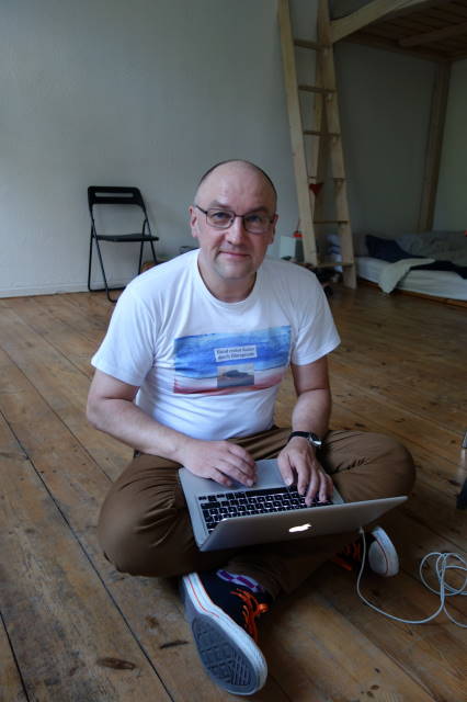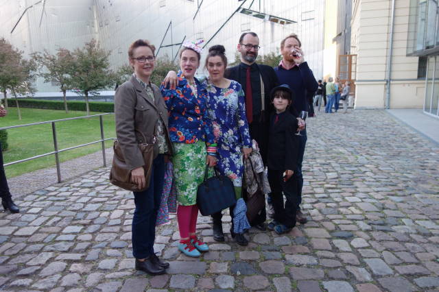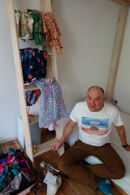 BVG ist scheiße. Warten 30 Minuten auf einem Bus, der schön auf der digitalen Anzeigentafel angekündigt war in ihrem neuen Bahnhof am Ostkreuz. Meine schlechte Laune macht den anderen Wartenden Angst. Der Wohnungstyp lässt uns auch warten und hat dafür alte Blumen dabei von denen er uns eine halb verwelkte in die Vase stellt. Das hätte er sich sparen können und Pünktlichkeit wäre mir lieber gewesen. Blick auf das Ufer gegenüber, alles grün. Unser Radverleih hingegen ist richtig gut. Man findet ihn schlecht im Internet. Das war Absicht, weil das Finanzamt hinter ihm her war und seine zig Läden geschätzt hat, vertraut er uns an. Das Radfahren ist super und schon einiges gesperrt für den Verkaufsmarkt der Hippies. Ohh noch ein Stand mit Löffeln aus Olivenholz. Jüdisches Museum, der Tunnel mit den blauen Blumen. Die Strickgruppe der ersten Stunde. Die Ausstellung Obediance erzählt die Geschichte von Jakob und Isaac.