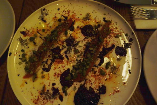 Industry Standard, die Nachbarn aus Zehlendorf sitzen nah an unserem Tisch und sie ist sehr darauf bedacht mit mir in Kontakt zu kommen. Bin ich Designerin? Sie kommt aus Kolumbien und ist „Smile Designerin“. Sehr lustig. Macht anderen die Zähne. Sie kommt mir eher vor wie eine Escortdame und er ist zwei Jahre jünger als Stephan. Ich dachte auch 51 und sieht halt älter aus. Die Bedienung kommt aus London, war zu Besuch da und Berlin ist billiger. Dieses Englisch sprechen gibt der europäischen Jugend eine Chance nach Berlin zu ziehen und macht uns wie Amsterdam. Dass nicht so viele in Hamburg hängen bleiben ist auch klar. Sie darf meinen Riesling probieren und bedankt sich. Ist angeblich der Lieblingswein des Personals. Dann die Neue aus London auch mal probieren lassen. Ich füttere die am Nachbartisch mit einer Schweinzunge auf Toast. Der Laden ist echt gut, auch die Nüsse mit Essig und das Tartar mit crispy chicken skin. Alles sehr lecker. Markus hat viele Bauchmuskeln und süße Geschenke, die ersten und einzigen, die mein Mann bekommt. Ich habe ihn vermisst, aber Morgenabend sehen wir ihn noch mal.