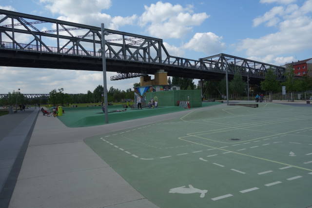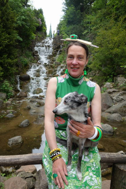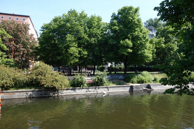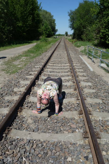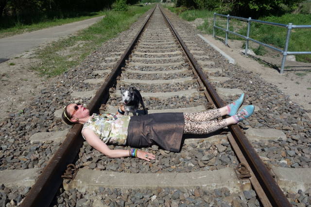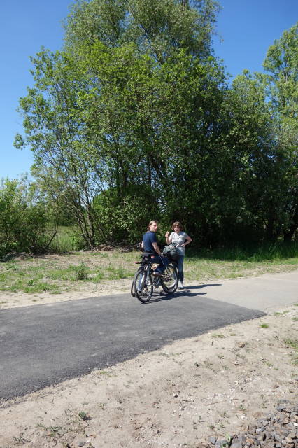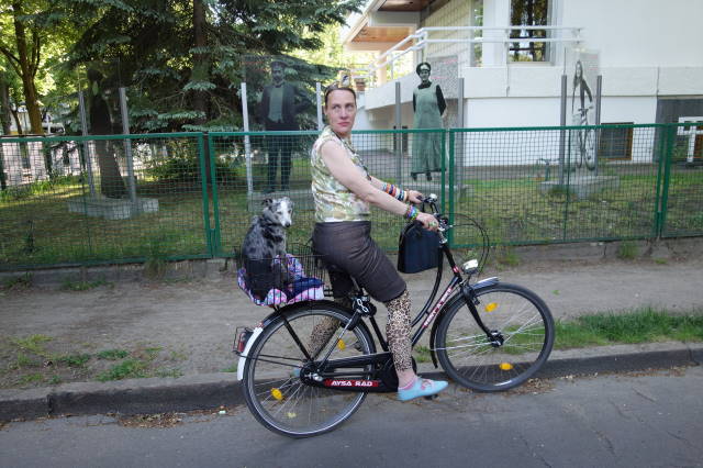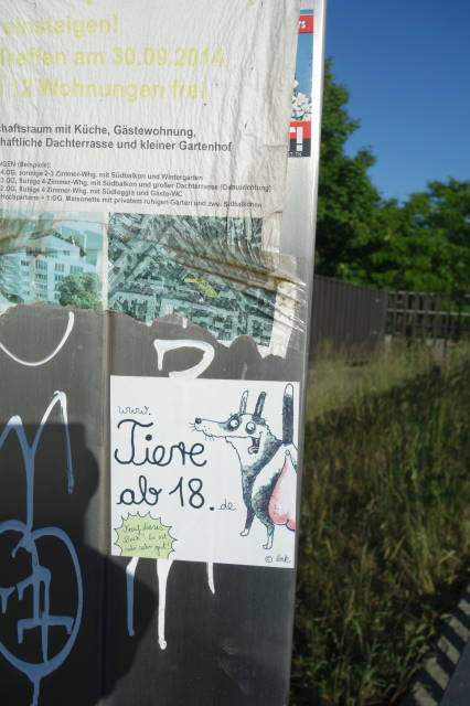 Heute der Radausflug mit Brigitte, Arnd und Carlchen. Der Italiener nebenan hat Konfirmation. Die Allee aus Zierkirschen, Pankow, Felder, immer weiter raus. Ich kann Suki mit einem Stöckchen so aufputschen, dass er ausversehen ins Wasser springt, mir zuliebe. Carlchen wird von Frauchen immer zu den Tränken geführt und praktisch gezwungen sich abzukühlen und richtig rein zu gehen, kneippen quasi. Ein junger Dackel und andere kreuzen unseres Weg. Carlchen hat immer Stress mit anderen Rüden. Unkastriert halt. Frauchen ist dann sehr angespannt, was kontraproduktiv ist. Überhaupt hat man das Gefühl, dass der Hund beruhigend und therapeutisch auf seine Besitzer einwirkt, wenn er an der Straße extra ruhig und langsam wird und so ihrer Aufregtheit entgegen wirkt. Birkenwälder. Das schönste Licht- und Schattenspiel. Gesprächsthema Arte und Kehl und alte Freundschaften. Holzplanken auf denen man herrliche Fahrradfahren kann, aber es sind viele Menschen unterwegs. Unter uns grünes Wasser, wo sind die Krokodile? Wir fahren über ein Sumpfgebiet mit Schautafeln der Tiere, die es hier gibt, Reiher und Biber und Bisamratten und dann das alte Dorf mit Biergarten und alter Schule. Die Band besteht aus Autisten. Nur eine Kleinigkeit, wir wollen in der Eberswalder was essen. Der Fernsehturm ist eine Stecknadel in der Ferne. Felder, durch die Weizenähren sieht alles unscharf aus. Villenviertel der DDR-Prominenz. Das Feuerwehrfest ist schon vorbei. Der Rückweg viel kürzer und führt durch den botanischen Garten Ost.