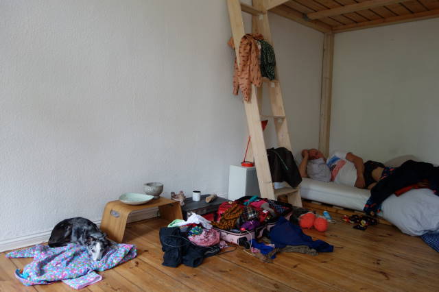 Drücke Steffi beim Treffen gleich rein, dass er bei uns nicht bellt und sie schuld sei. Es ist tatsächlich wohl die Führerschaft, die ihn verstummen lässt. Er darf auch nicht im Bett schlafen, hat mehr Regeln und wird auch mal auf seinen Platz geschickt und zwar dauerhaft und konsequent. Kein Verfolgen vor dem Aufbruch und beim Anziehen. Ich glaube ja, dass ihm das auch gut tut, außerdem kann man ihn dann überall mit hinnehmen. Es ist nur eine Frage der Zeit, da würde er das kapieren und automatisch machen. Davon bin ich überzeugt. Nicht aufs Bett war in Berlin eine Herausforderung, weil die Matratze liegt auf der Erde. Sehr süß, wie er davor steht und schaut, ob der Chef sich regt. Anm.: kein Beweisfoto. Hier liegt er auf seinem ihm zugewiesenen Schlafplatz, aber man sieht die Örtlichkeit.