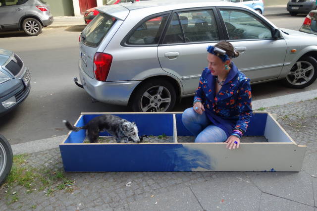 25.05. Im Berliner Hausflur (Erdgeschoss) kläfft immer ein Hund. Beim Gehen mache ich den Test, auch wenn ich ohne Suki den Müll runter bringe, kläfft er, aber weniger doll. Das Leute sich so was antun. Ein Teebeutel baumelt so verlockend unter der Tonne.