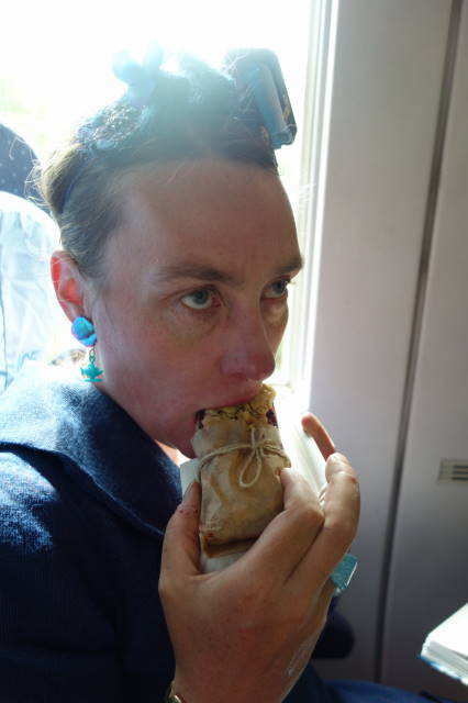 Noch mal lecker frühstücken. Hundeübergabe. Ob sie das selber backen, fragte eine Frau. Nee, das sind die Backmischungen von Rewe (sagt Stephan zu mir). Viel Englisch, aber manchen tun nur so. Eine Frau, die sich mit englisch sprachigen unterhält höre ich sagen (als sie eine Gala durchblättert): „Jonny Depp has also come into the years“.