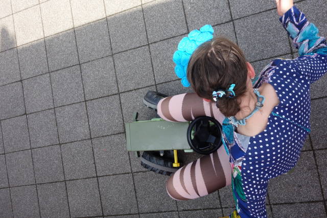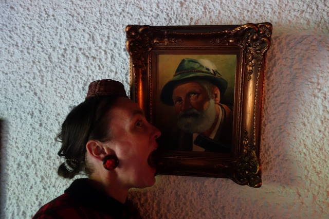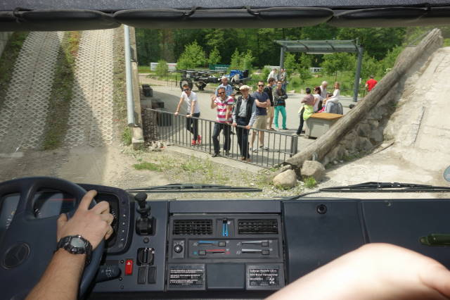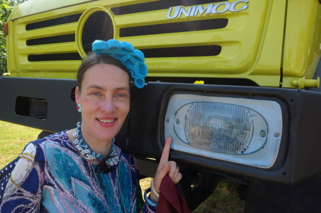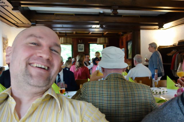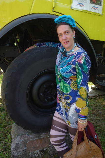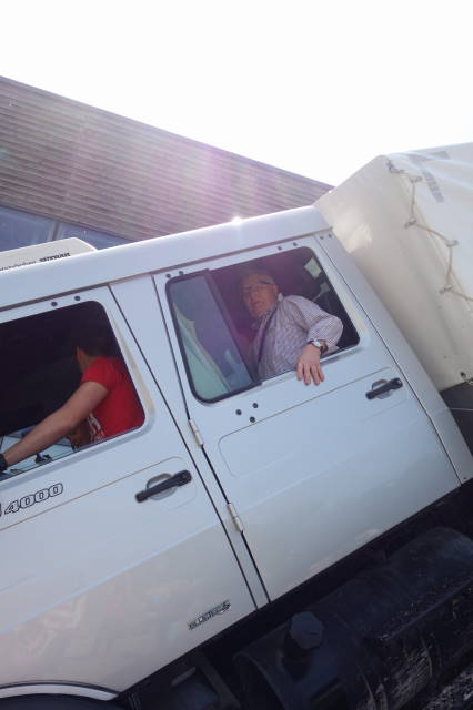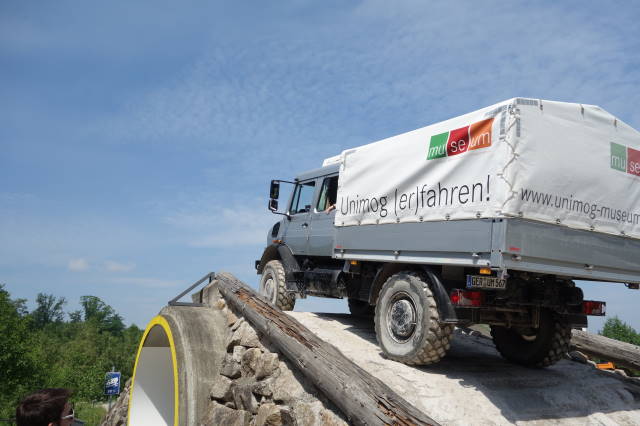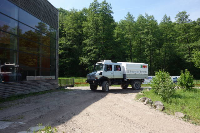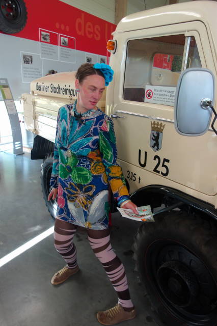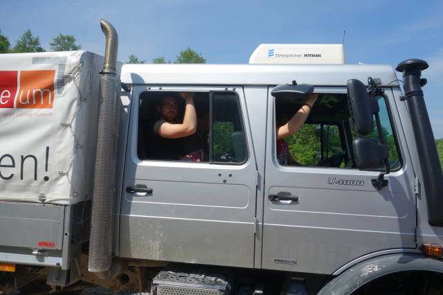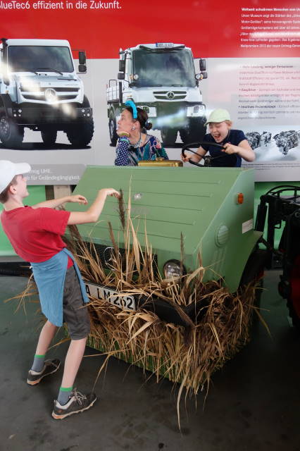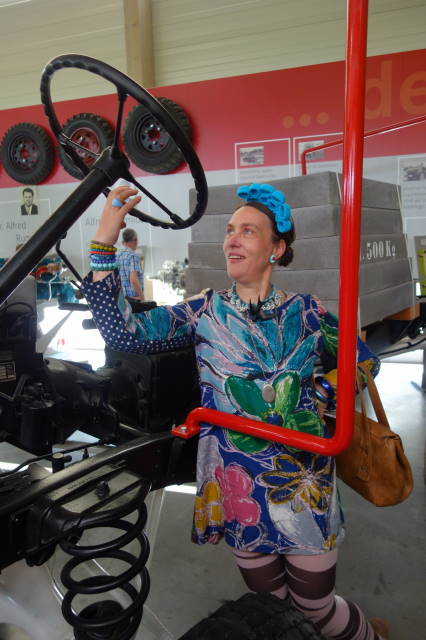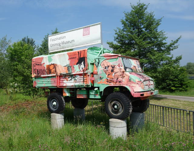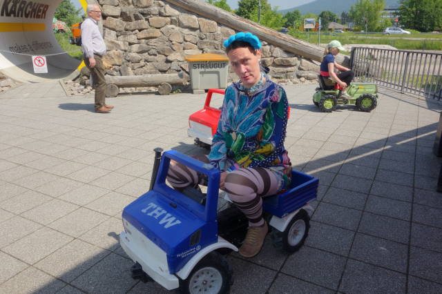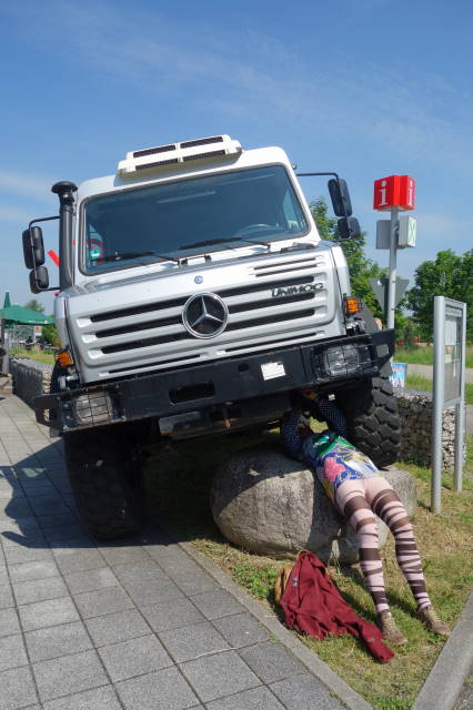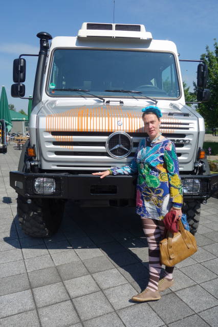 16.05. Morgens tuschen im Hotel Zimmer und Tee kochen mit dem Wasserkocher. Leider ziehe ich den Stecker zum Kühlschrank und da ist der Käse aus Straßburg drin, aber das bemerken wir erst bei der Abreise. Nach dem Frühstück Unimog-Museum. Ich jubele, weil ich da ohnehin hin wollte (wir waren auf dem Weg aus Straßburg dort vorbei gefahren in Gaggenau). Das ist das Kinderprogramm. Es werden unkaputtbare Fahrzeuge ausgestellt und überwiegend ist anfassen verboten. Zum Glück gibt es eine Go Kart Bahn, aber mit Fahrer. Der ist humorfrei. Er zeigt was die Karre alles kann, stabil bis 38 % Seitenlage usw. steil hoch fahren über eine Treppe ohne Anlauf, Achsen, die getrennt arbeiten und nicht aufsitzen, wenn man über Hindernisse fährt, also ursprünglich als Mondfahrzeug konzipiert (mein Kommentar) und viele Vorteile, aber Parkplatz in der Innenstadt finden, ist schwer oder? Will ich wissen und wie viele Abschlüsse er heute schon gemacht hat und ob wir in Raten zahlen können (kosten 150.000). Schatz, wenn wir die Kinder sicher in den Kindergarten bringen wollen und der SUV nicht ausreicht. Ein Verwandter hat eine ernste Frage, ob die Firma vor oder nach dem Krieg gegründet wurde. Das weiß er nicht, er „fährt nur“. Dann Flohmarkt. Bekomme Deko-Wandteller geschenkt, den ich im Vereinsheim auf der Damentoilette hinterlasse. Die unscheinbare Eisdiele (die auch Tourinepp hätte sein können, da wo sie gelegen ist) ist spitze und es gibt so Sorten wie Erdbeer-Balsamico Eis und Weltklasse Pistazieneis. Uli hat den halben Koffer voller Popcorn und geht dann zu Rossmann und holt Erdnuss Flips und Salzstangen für den Re-Import nach England. Abends Nachtigall. Der Veranstalter hat eine Doppelbelegung (Hochzeit und er ist Trauzeuge) und lässt seine angeheiratete Frau und die Tochter alleine das Hauptprogram durchstehen. Gutes Essen, sehr preiswert, netter Abend. Mein Cousin Volker mit seinen entzückenden Töchtern, der ein Hotel in der Schweiz betreibt, stößt noch dazu. Lerne Moritz kennen, den Sohn meiner Cousine, den ich beim Frühstück beeindruckt habe, weil ich den Fett von seinem Schinken gegessen habe mit der Bemerkung, dass wir eine Koalition eingehen können und er isst das Rote und ich das Weiße und er brachte mir den weißen Teller mit weiß drauf, den ich zuerst für leer hielt. Er liest gerade Winnetou (sein Vater hat alle Bände bis auf 2) und will mir was vorlesen, aber das schaffe ich erst morgen früh nach dem Frühstück, wenn die Batterie wieder aufgeladen ist. Abends Eierlikör aus dem Schweizer Wohnwagen und Frauengespräche. Ich soll morgens Wachteleier aus dem Wohnwagen bekommen.