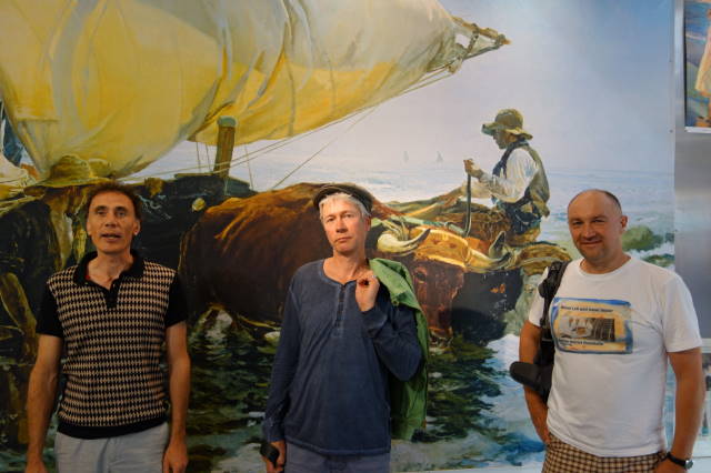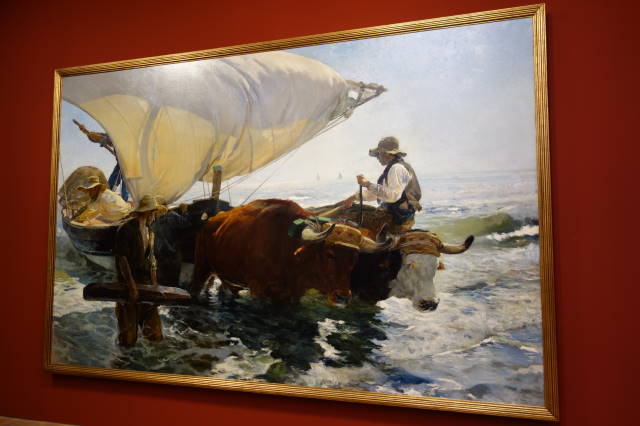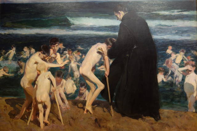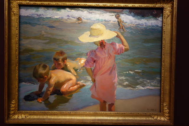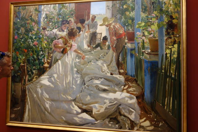 Dann gehen wir in die Ausstellung mit dem Licht. Echt tolle Bilder dabei, komisch, dass man noch nie was von dem Typen gehört hat, der ist schwer begabt. Ich mag einzelne Bilder sehr, vor allem die mit den Jungs unter Wasser, die sind so toll gemalt, auch die Farben. Zum Teil skurrile Bildauswahl: der Priester mit den kranken nackten Kindern. Ich bin so ignorant, dass ich wieder nicht weiß, wie der Typ heißt (Joaqín Sorolla), habe einfach nicht geschaut. Markus ist nicht mit reingegangen. Ich habe wieder das Problem mit nicht genug getrunken. Ich hole den weißen Mantel und auf dem Weg noch einen weißen Glasring, Swarovski Modeschmuck. Stephan führt mich hin und bittet mich reinzugehen. Die Inhaberin hat tolle Basttaschen aus den 50er und entscheidet nach Sympathie meint der Typ, der gerade einen Anzug anprobiert und sie erklärt, er kann mitwachsen und das soll nicht so eng und er: er wollte nicht mehr wachsen und mhhhhm und ich ohne es zu sehen: Begeisterung klinge anders und er: Männerbegeisterung und ich zahle 5,- € weniger ohne gefragt zu haben.