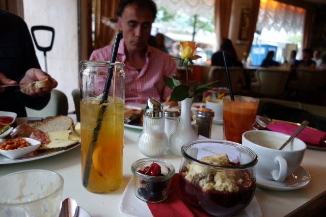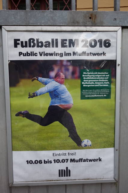 Doch noch was essen gehen. Ich könnte glatt hier bleiben und habe auch keinen Hunger, nehme meine letzten Energien zusammen, weil ich doch dabei sein will. Jetzt weiß ich, ich hätte eine Angoraunterhose mitnehmen sollen. Dann hätte ich besser draußen sitzen können. Stephan kommt nicht vom Telefon weg mit meiner Cousine und er sagt gar nichts. Das scheint alles komplizierter zu sein und sie erzählt von den Problemen des Sohnes und sie will nicht alleine Fußball gucken und ich bereue es schon und vor allem wollen wir alle los. Im Innenhof wieder Volksmusik und ich sage: das hören die Leute auch privat- krass. Es wird das Fiedler und Fuchs mit grünem Putzmustern in 30er Jahre Häusern, wie Michi meint, gegenüber. Das Mädchen zu mir: das ist ein lustiger Schlauch den Du auf dem Kopf hast. Michi: Das ist doch kein Schlauch. Ich sage, es sei eine Brezel und stelle es auf und, das sei nur blöd zum Radfahren, wenn es steht und sie: das ist doch keine Brezel. Ich kannte die nicht besser und habe mein Bestes gegeben. Was stimmt denn nicht, welcher Teil. Das kann sie mir auch nicht erklären. Die Frau neben uns sagt zu viele Enden. Das Typ hinter uns unterhält sich über Steuerhinterziehung, die nicht so doll bestraft werden dürfe wie Kindervergewaltigung und zu versteuerndes Gesamteinkommen von 100.000 €. Das sind nicht die Themen, die mich anmachen. Gegenüber schlecht erzogene Hunde, die alles zusammenkläffen und die Besitzer verharmlosen das und versuchen es mit Schnauze zuhalten. Der Weimaraner von dem Hippiemädel ist kurz davor sich beim Obazda vom Tisch zu bedienen. Gefüttert werden sie alle vom Tisch. Keiner hat seinen Hund im Griff und ich denke, die darf man doch nicht in so eine engbestuhlte Gastronomie nehmen. Ich denke unweigerlich ans Büro. Erfreulich wenig Deutschlandbeflaggung in München. Man sieht kaum was. Das scheint ein Unterschichtenphänomen zu sein. Nach den Vorspeisen sind wir schon satt. Es war viel zu viel und man hätte sich 2 oder 3 Hauptspeisen teilen sollen und zumindest 3 in der Gruppe geht es nicht richtig gut danach. Markus Hauptgericht kommt nicht mit unseren. Stephan nimmt noch Marillenknödel, die auch ewig dauern, der Strom ist ihnen rausgeknallt und die gesprächige zweite Bedienung (männlich) hat das erste Mal ein Nikorette-Spray ausprobiert, wie er uns wissen lässt und das schmeckt echt scheiße und sei total scharf. Die erste Bedienung sortiert Besteck. Schlussendlich gibt es wenig Trinkgeld. Die Leistung war auch mäßig. Sie ist sauer und er verabschiedet sich mit Handschlag und ich habe das Gefühl, er wäre mir am liebsten um den Hals gefallen. Das ist schön unsynchron. Ich bin wieder mal platt.