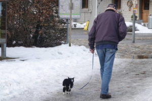 Ein Mann führt seine alte Katzer Gassi, schön über die Eispfützen….Einer der seltsamsten Anblicke ever.