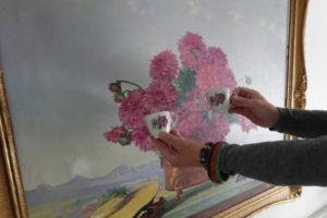 Die Espresso-Tassen aus dem Brocki vor dem Bild in unserem Zimmer