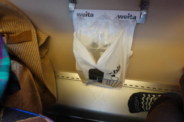 Statt Mülleimer, hängen im Zug Müllbeutel, die dann abgerissen werden. Geniales Prinzip, muss man die Eimer nicht reinigen z.B. Habe ich noch nie gesehen. Neben Ricola, haben sie das wohl auch erfunden…